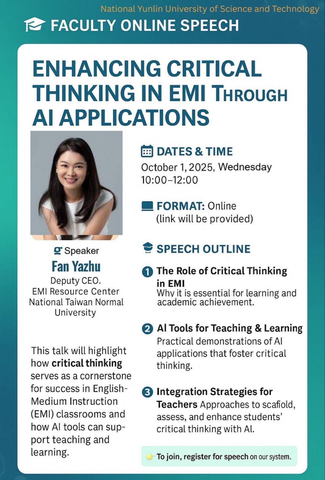 【活動公告】國立雲林科技大學謹訂於114年10月1日(星期三)舉辦「人工智慧應用於EMI教學:批判性思維的強化之道」線上講座,敬邀本校師生踴躍參加。