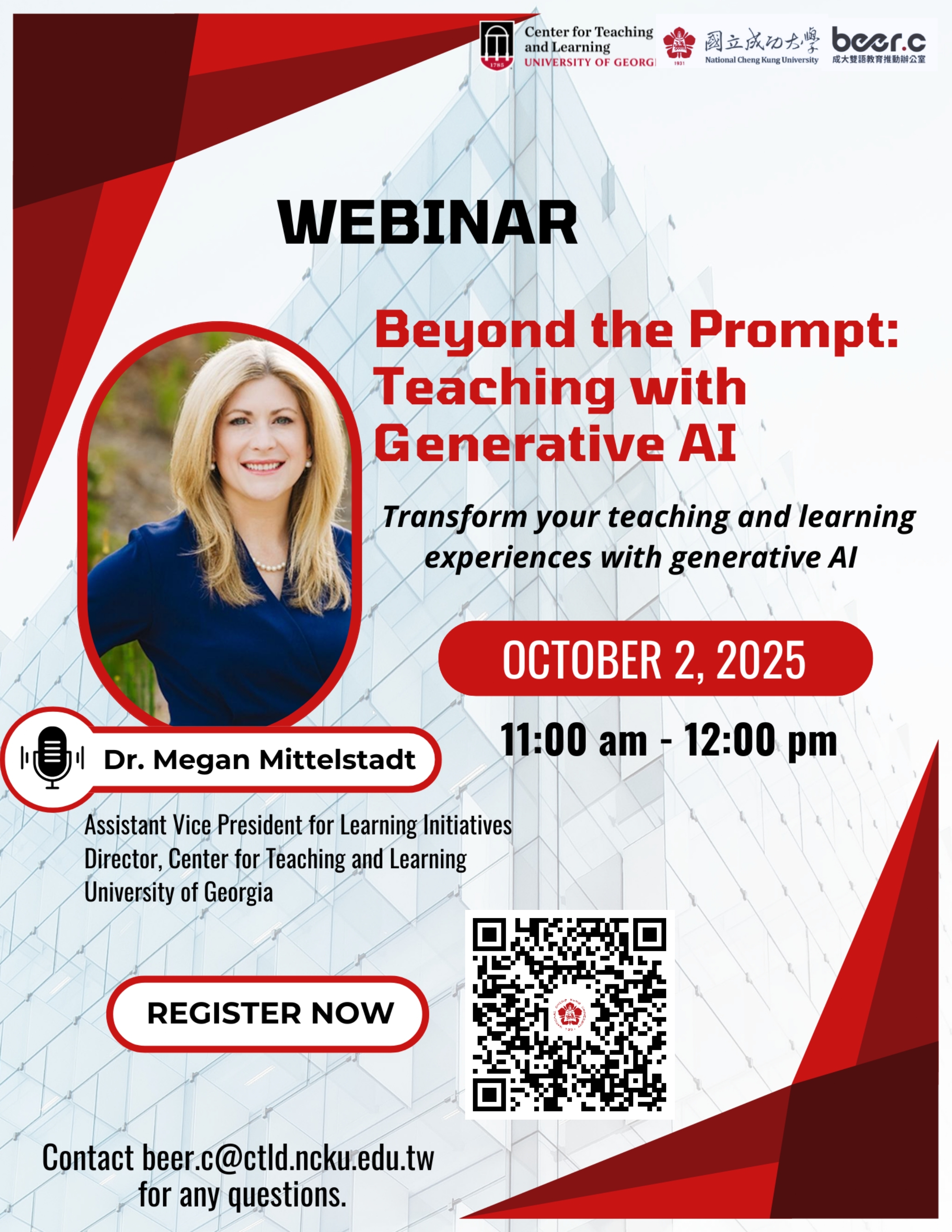 【活動公告】國立成功大學雙語教育推動辦公室辦理全國大專校院EMI教師生成式AI融入教學線上工作坊-Beyond the Prompt: Teaching with Generative AI,敬請本校所屬人員踴躍參與。