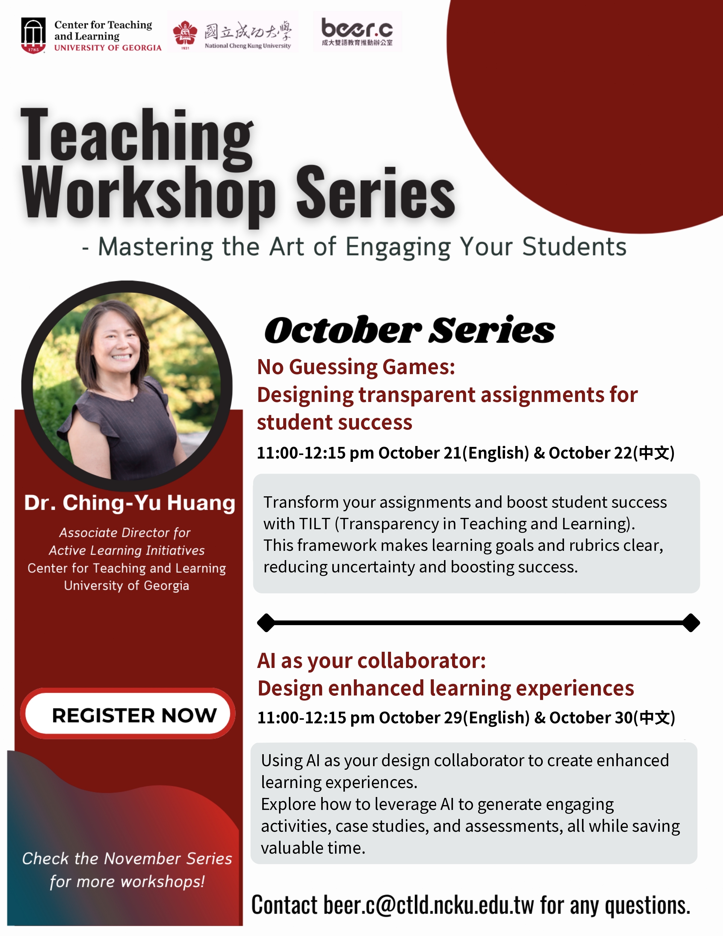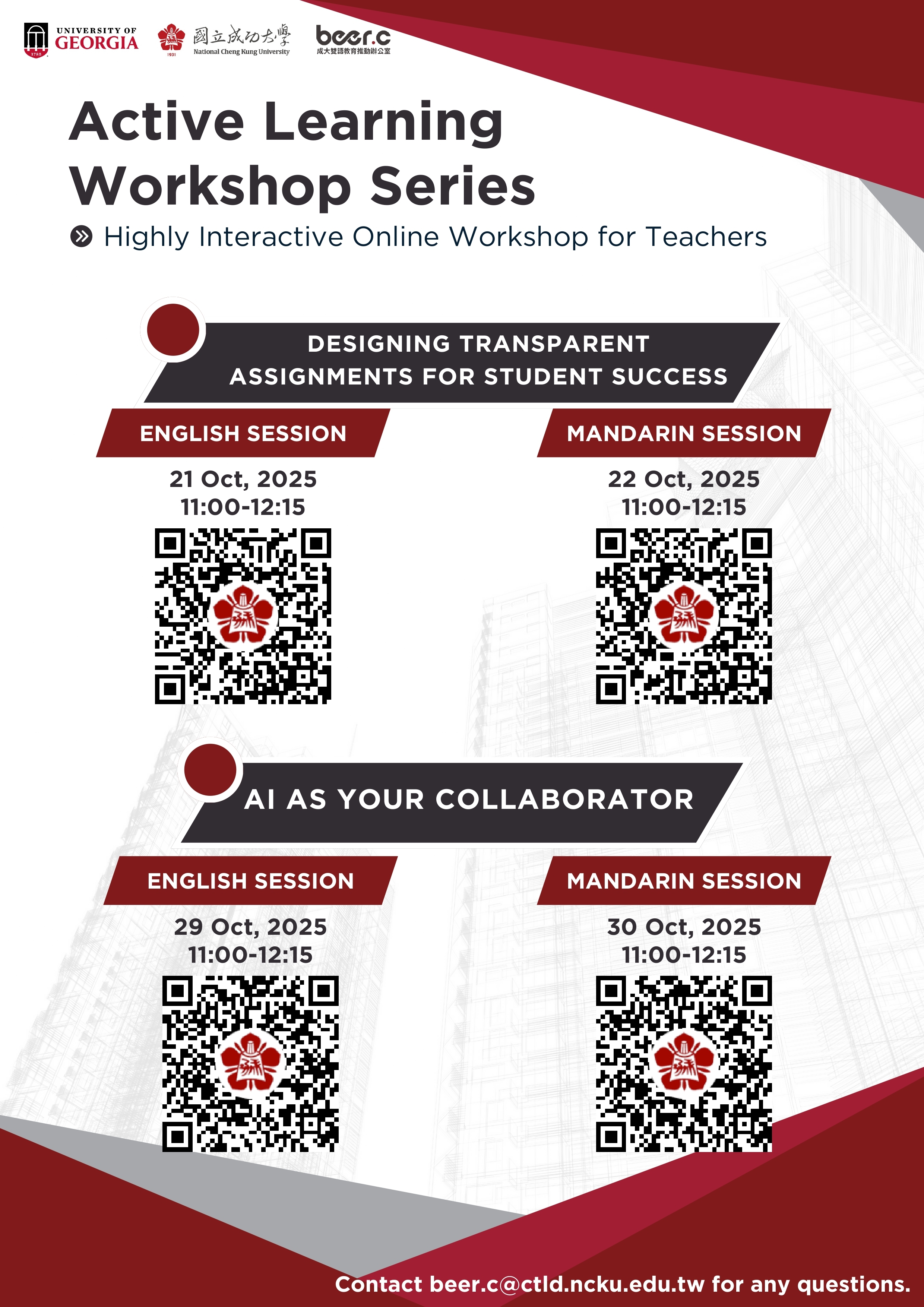 (一)主題一:No Guessing Games: Designing transparent assignments for student success英文場次活動時間:114年10月21日(二) 11:00-12:15中文場次活動時間:114年10月22日(三)11:00-12:15