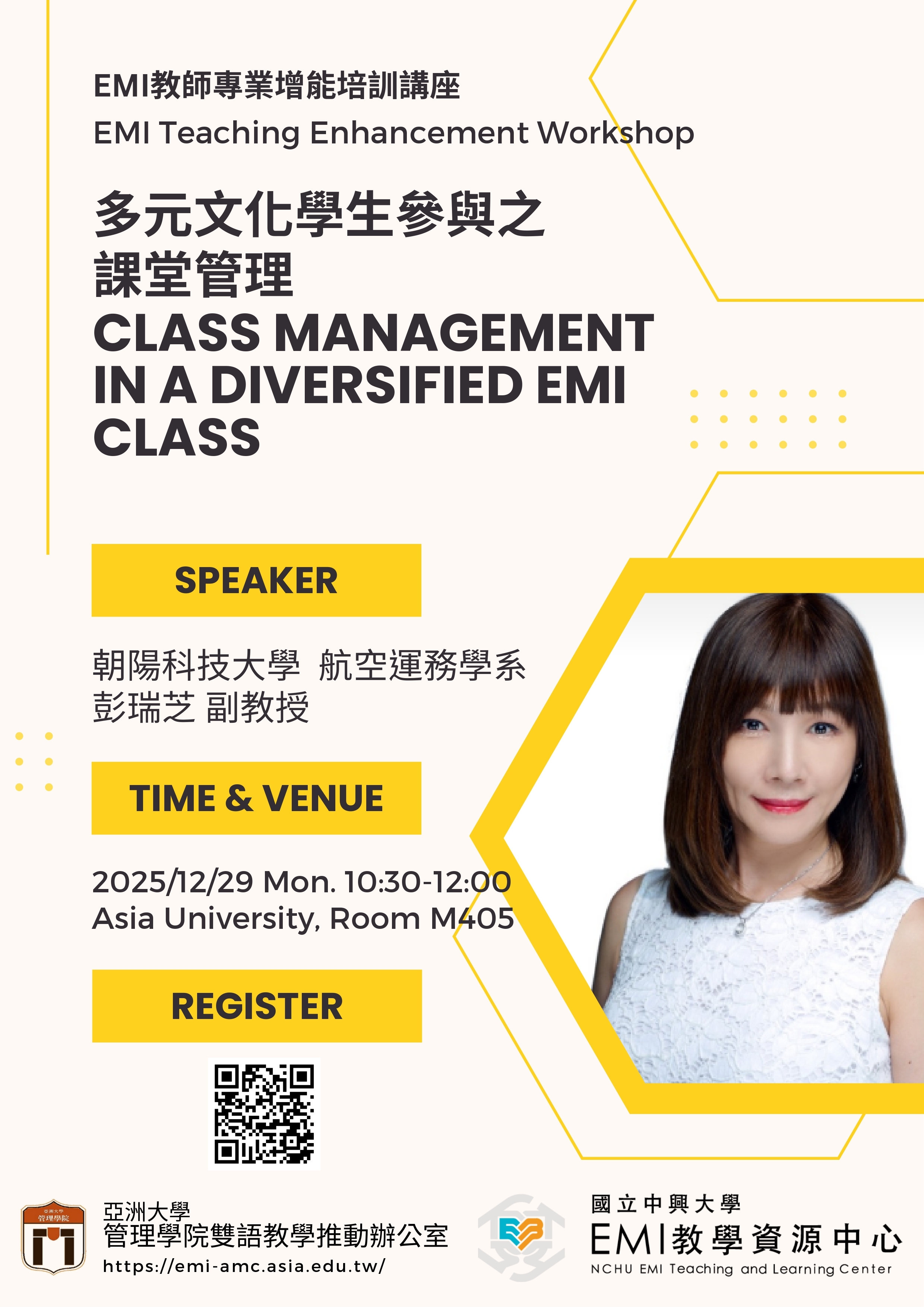 【活動公告】國立中興大學EMI教學資源中心與亞洲大學合作辦理之「多元文化學生參與之課堂管理Class Management in a Diversified EMI Class」教師工作坊資訊,敬請本校教師踴躍報名參加。